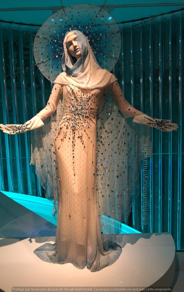 La visite commence avec la célèbre robe Chimère, portée par Adriana Karembeu lors du défilé Haute-Couture automme-hiver 1997-1998. Véritable petit bijou, elle est d’ailleurs considérée comme l’une des robes les plus chères de l’histoire de la mode. Elle introduit la partie consacrée au Bestiaire de Thierry Mugler, inspirée des insectes, papillons, oiseaux ou encore des reptiles.