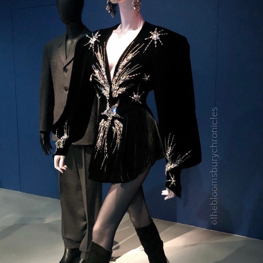 Thierry Mugler est aussi le couturier des artistes avec qui il collabore régulièrement. C’est notamment le cas de George Michael pour son clip Top Funky. A cette époque le chanteur boycotte sa maison de disque et refuse d’apparaitre dans ses clips. Il réunit alors les supermodels de l’époque, de Linda Evangelista à Estelle Lefebure, dans un même clip et habillées en Mugler bien entendu. Une pièce entière de l’exposition est dédiée à ce clip.