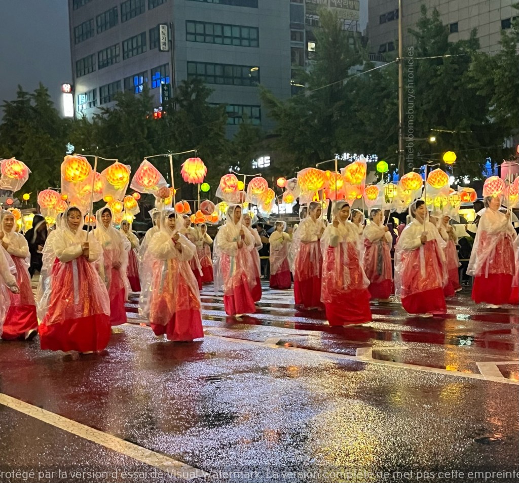 • Le moment le plus emblématique de ce festival est la parade des lanternes qui passe par l’avenue Jongno jusqu’au temple de Jyoge-sa. Le temps était pluvieux mais la parade a bien eu lieu et la foule était au rendez-vous. Les participants habillés de tenues traditionnelles ou religieuses portaient des lanternes de lotus. La parade comprend aussi de magnifiques chars lumineux, notamment en forme de dragon ou de lotus. Impossible pour moi de manquer ce spectacle, quitte à rester 2 heures sous la pluie. Assister à la parade reste à ce jour l’un des plus beaux souvenirs de mon voyage à Séoul et je suis heureuse d’avoir pu y assister.